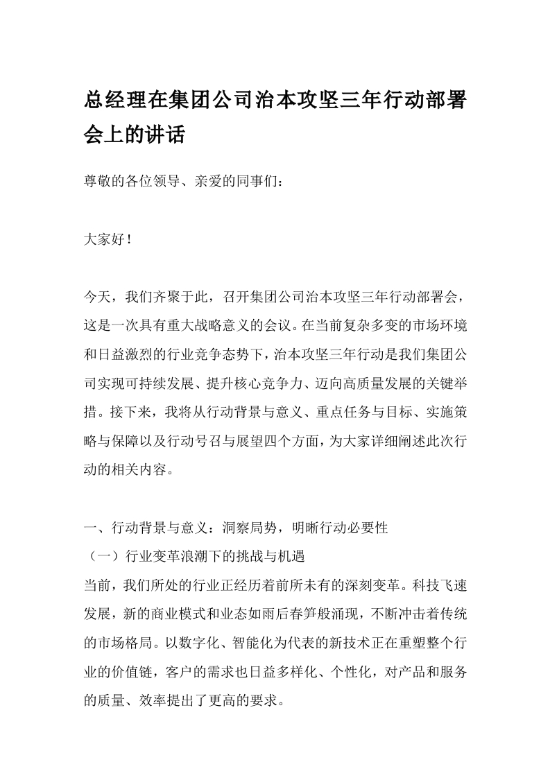 总经理在集团公司治本攻坚三年行动部署会上的讲话