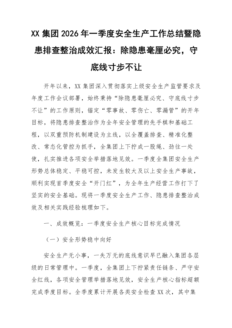 XX集团2026年一季度安全生产工作总结暨隐患排查整治成效汇报:除隐患毫厘必究,守底线寸步不让