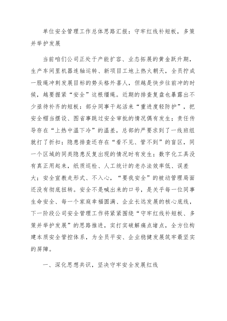 单位安全管理工作总体思路汇报:守牢红线补短板,多策并举护发展