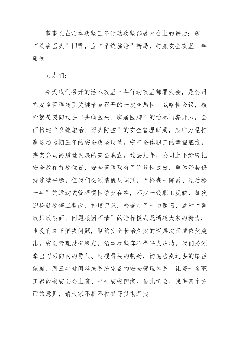 董事长在治本攻坚三年行动攻坚部署大会上的讲话:破“头痛医头”旧弊,立“系统施治”新局,打赢安全攻坚三年硬仗