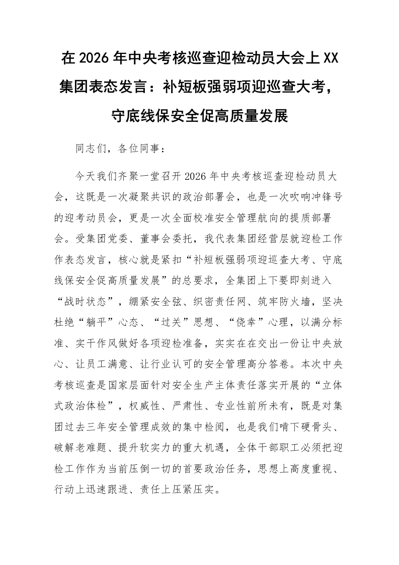 在2026年中央考核巡查迎检动员大会上XX集团表态发言:补短板强弱项迎巡查大考,守底线保安全促高质量发展