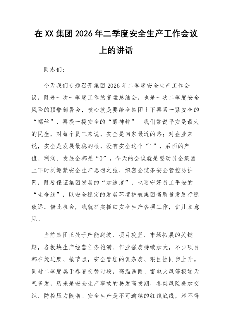 在XX集团2026年二季度安全生产工作会议上的讲话